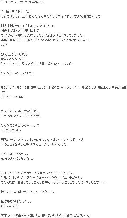 | あんたはわしより上の身分じゃけん。 憐れみは一切掛けんよ。 「可哀想」言う言葉があるやろ。 あれな、「上から目線」やんか。 あたしはあんたより身分が低いけん、 あんた、なんて高貴な人間に使ってっちまう程身分が低いんや。 でな、おまえさんはの、一番恐ろしい地獄 あっかどうか分かんねぇけどな。 そこ行くんだよ。 人間がつけるけじめと 動物がつけるけじめ そして神様がつけるけじめ。 そして まぁな 色々あるわな。 神様がつけるけじめって知っとるか? うん まぁそうだわな。 そういうこった。 誰からも好かれず 嫌われず、 存在自体ない存在ってやつさ 幽霊だって気付かない。 精霊も妖精も神々たちでさえも気付かない。 俺だけだ。 だからよ、寂しくなったらこいよ。 おまえのこと気付いてやっからよ。 さようなら、私の妹。 ラスト・ロストチャイルド |